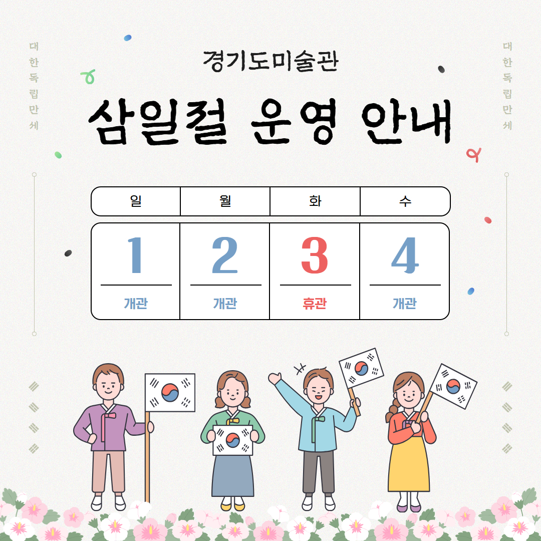 경기도미술관은 2026년 삼일절 및 대체공휴일에 아래와 같이 운영하오니 방문하실 때 참고 부탁드립니다.