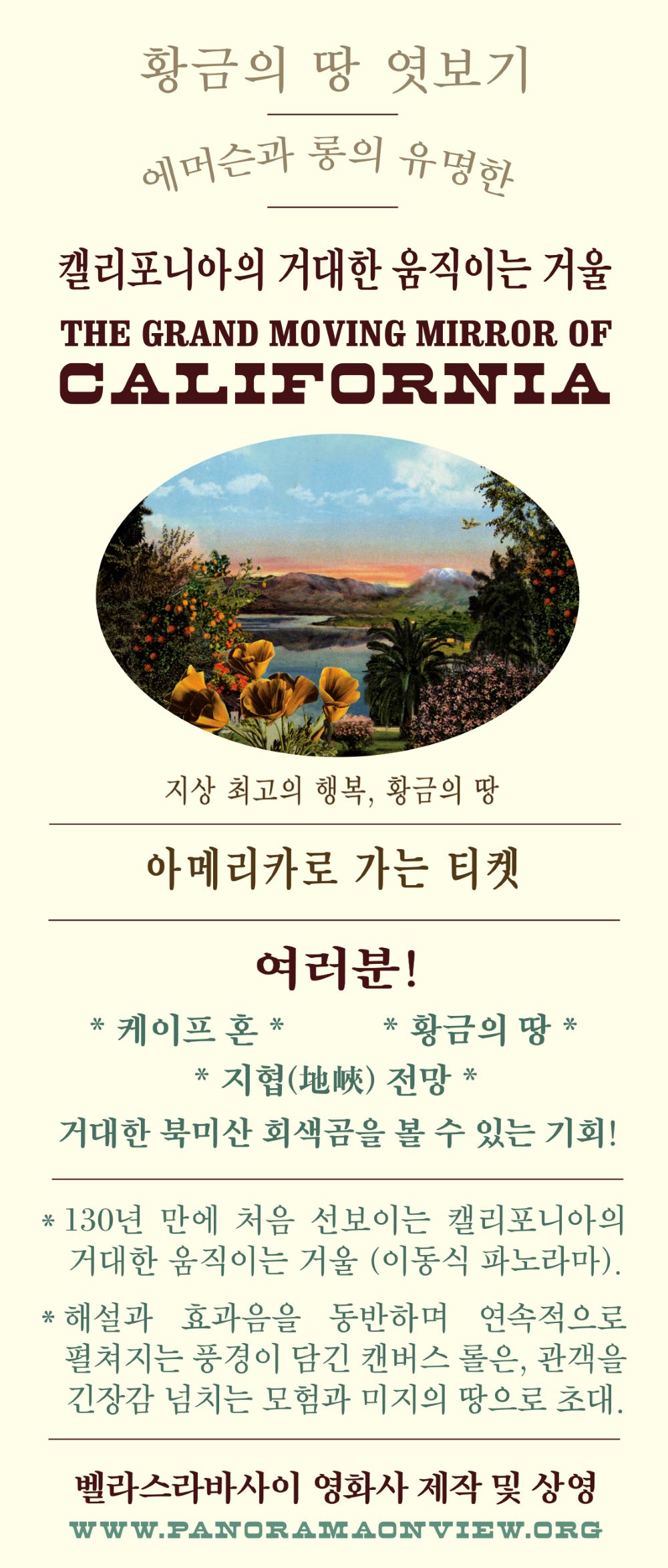 〈캘리포니아의 거대한 움직이는 거울〉(1853)은 60미터 길이의 파노라마 회화로 19세기에 성행하던 무빙 파노라마 방식의 작업이다. 무빙 파노라마는 영화가 발명되기 이전, 가로로 긴 화폭에 그린 회화 스크롤을 천천히 돌려 이동시키는 방식으로 장면을 바꿔가며 무대 위의 해설자가 관객에게 이야기를 전달하는 방식의 공연이다. 2015년 서울에서 개최한 킴킴 갤러리 기획전 <토킹 픽쳐 블루스> 이후, 본 전시<트라우마 자랑>에 다시 소개되는 이 작품은 로스앤젤레스의 벨라슬라바세이 파노라마의 설립자이자 디렉터인 사라 벨라스(Sara Velas)에 의해 복원된 것으로, 캘리포니아의 초기 역사를 묘사하고, 당시의 풍경과 문화를 표현하는 이 작품은 2010년 벨라슬라바세이 파노라마에서 초연되었다. 2005년, 원작의 대본이 미국 메인주의 사코 박물관(Saco Museum)의 수장고에서 발견된 후, 벨라스는 당시 스크롤이 유실되고 대본만 남았던 이 작품을 크랭킹 장치와 내레이션, 음악을 포함한 무빙 파노라마 방식의 원작을 성공적으로 동시대로 소환했다. 이 복원 작업은 독특한 시각적 경험을 제작하고 발표하는 것에 주력하는 전시장, 공연장, 정원을 갖춘 특별한 기관인 벨라슬라바세이 파노라마의 다양한 분야의 전문적 팀에 의해 진행되었고, 다양한 크기의 버전으로 제작되었다.