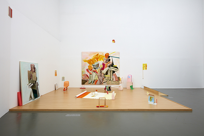 미팅 플레이스, 캔버스에 오일, 종이에 오일, 포장된 회화, 세라믹, 나무봉, 스폰지, 마스킹 테이프, 오렌지, 스티로폼에 석고, 아크릴관, 공산품, 클레이, 나무프레임, 가변크기, 2018