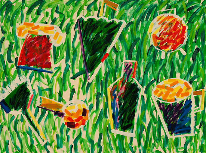 무엇이든 그림이 될 수 있다는 작가의 생각처럼 놀이-사물그리기(1085) 작품에서는 우산, 물병, 전화기 등 일상의 사물이 주인공이다. 작가 특유의 단순한 형태로 재탄생한 일상의 사물들이 작품 속에서 춤을 추는 것 같은 경쾌함을 선사한다.