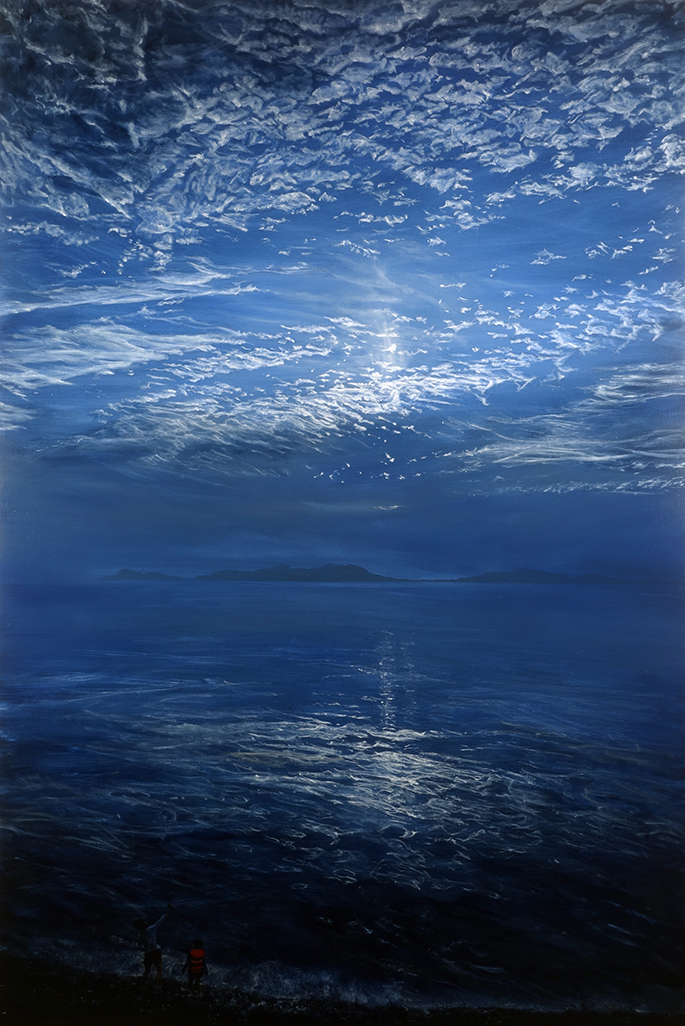 ‘돌던지기(2017)’는 회화적 직접성으로 표현 된 바다풍경이다. 숭고한 느낌마저 드는 바다풍경을 자세히 살펴보면 하단에 돌을 던지는 소년들의 모습을 발견할 수 있다. 파도가 넘실거리는 바다에 돌을 던지는 모습은 어떤 느낌으로 다가오는가?