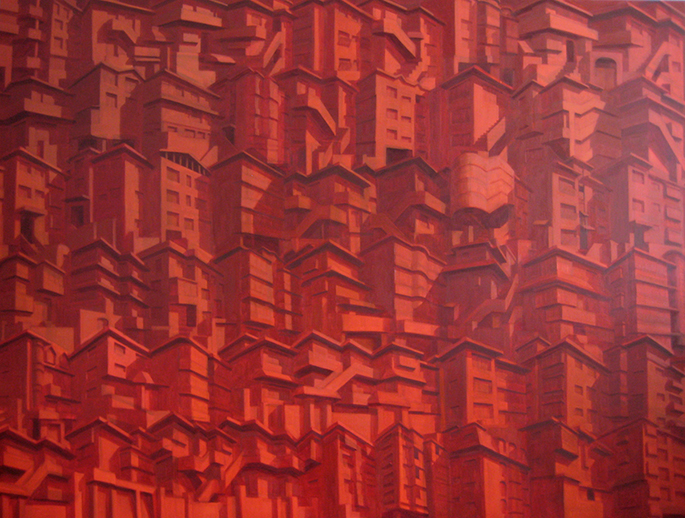 풍경을 다루는 작가 정직성은 도시의 익숙한 풍경을 낯설음으로 다시 보게 해 준다. 우리가 살고 있는 공간에 대해 질문을 던지는 정직성의 그림은 늘 지나다니지만 무심코 지나치는 공간을 주인공으로 화면에 그려낸다. 200916은 급격한 도시화로 인해 만들어진 한국 도시의 특수한 풍경을 회화라는 형식으로 표현한 풍경화이다. 하나의 색조로 통일 된 풍경 속에 기본적인 도형들이 채워져 있는 화면은 마치 추상화와 같아 보인다. 그러나 자세히 살펴보면 붉은 색 바탕에 연립주택의 형태들이 반복적으로 앉혀져있다. 리듬감이 느껴지는 그림 속 풍경들이 우리에게 어떤 이야기를 건네는 것일까?