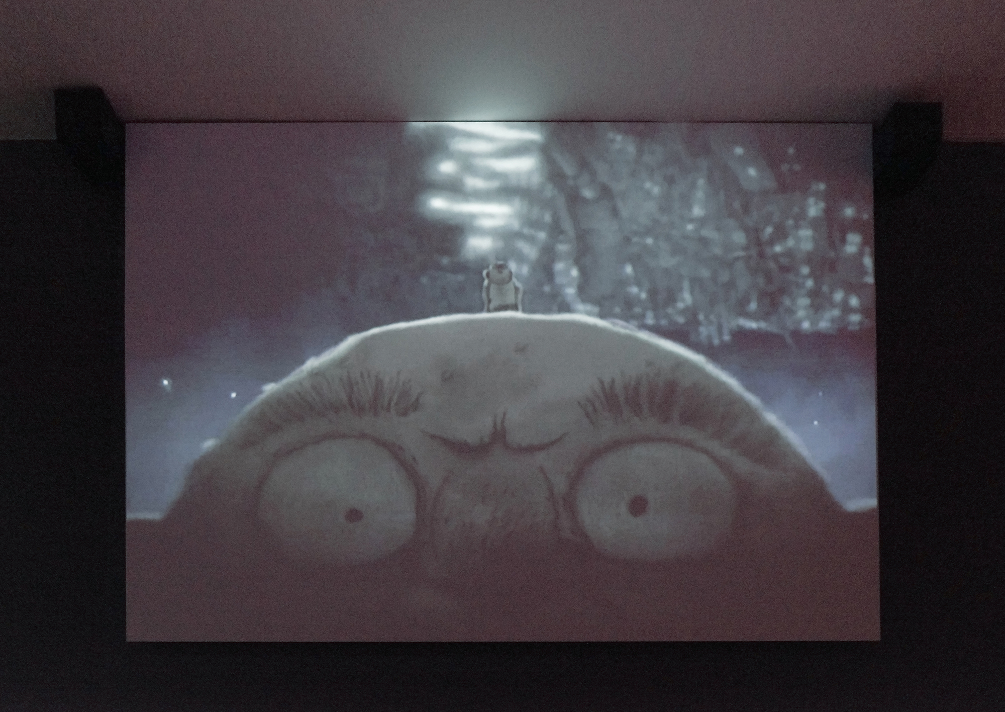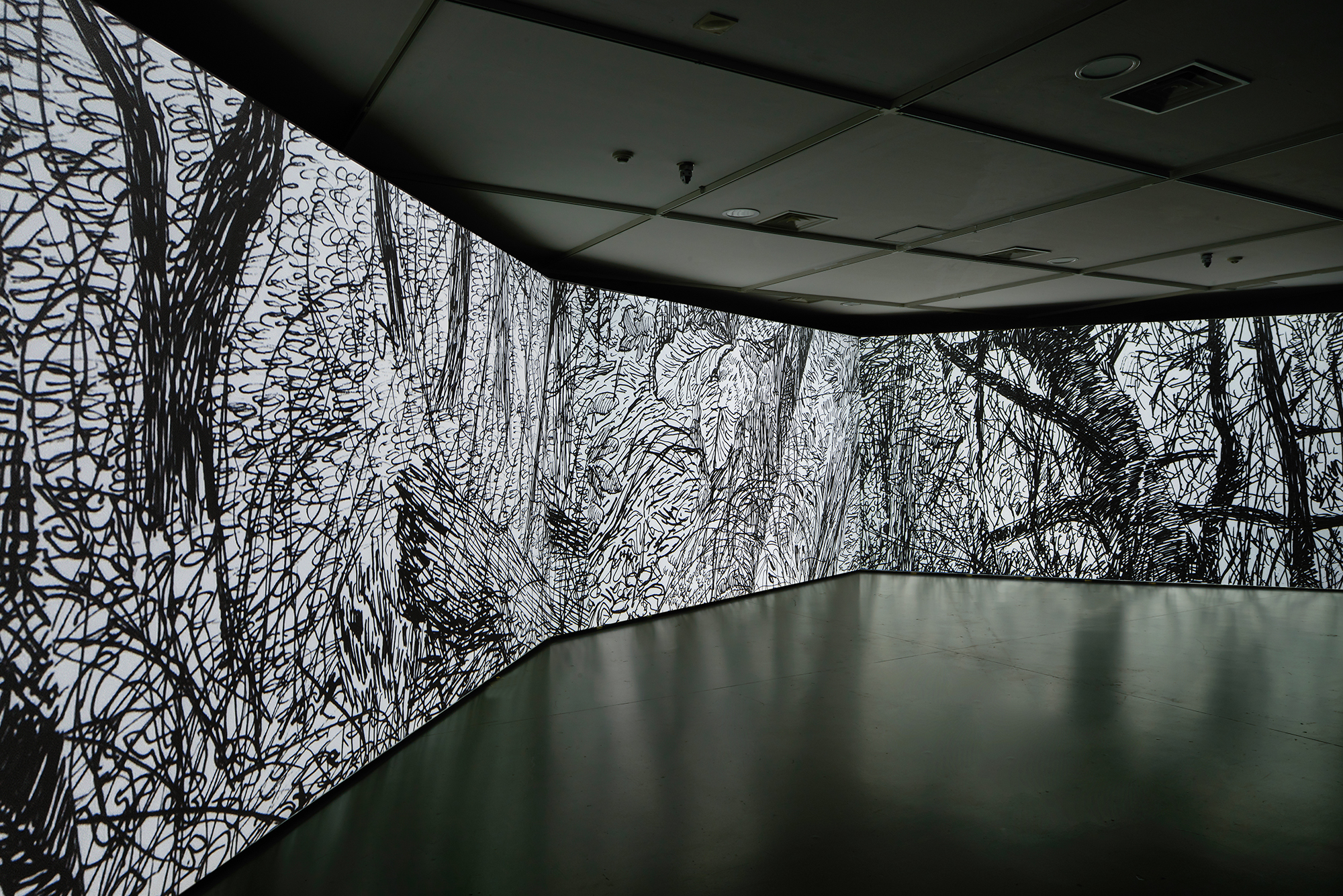 <검은 바람, 모닥불, 그리고 북소리>는 작가가 현실과 가상에서 수집한 여러 영상들을 기반으로 제작한 애니메이션과 일상에서 경험하고 사유한 것들을 상상으로 풀어낸 애니메이션들이 서로 뒤섞여 있다. 출근길의 사람들을 본 따 만든 불 모양 사람의 행진, 게임의 마지막 순간처럼 넘어지는 남자, 날씨를 예보하는 손 동작과 같이 일상에 근거를 둔 이미지들이 이어지는 드로잉 선들 사이에서 진동하고 호흡한다. 작가는 반복적이고 일상적인 현실의 틈을 공상으로 메우며 은유적인 도상과 운율로 가득한 사색의 풍경으로 이끈다.