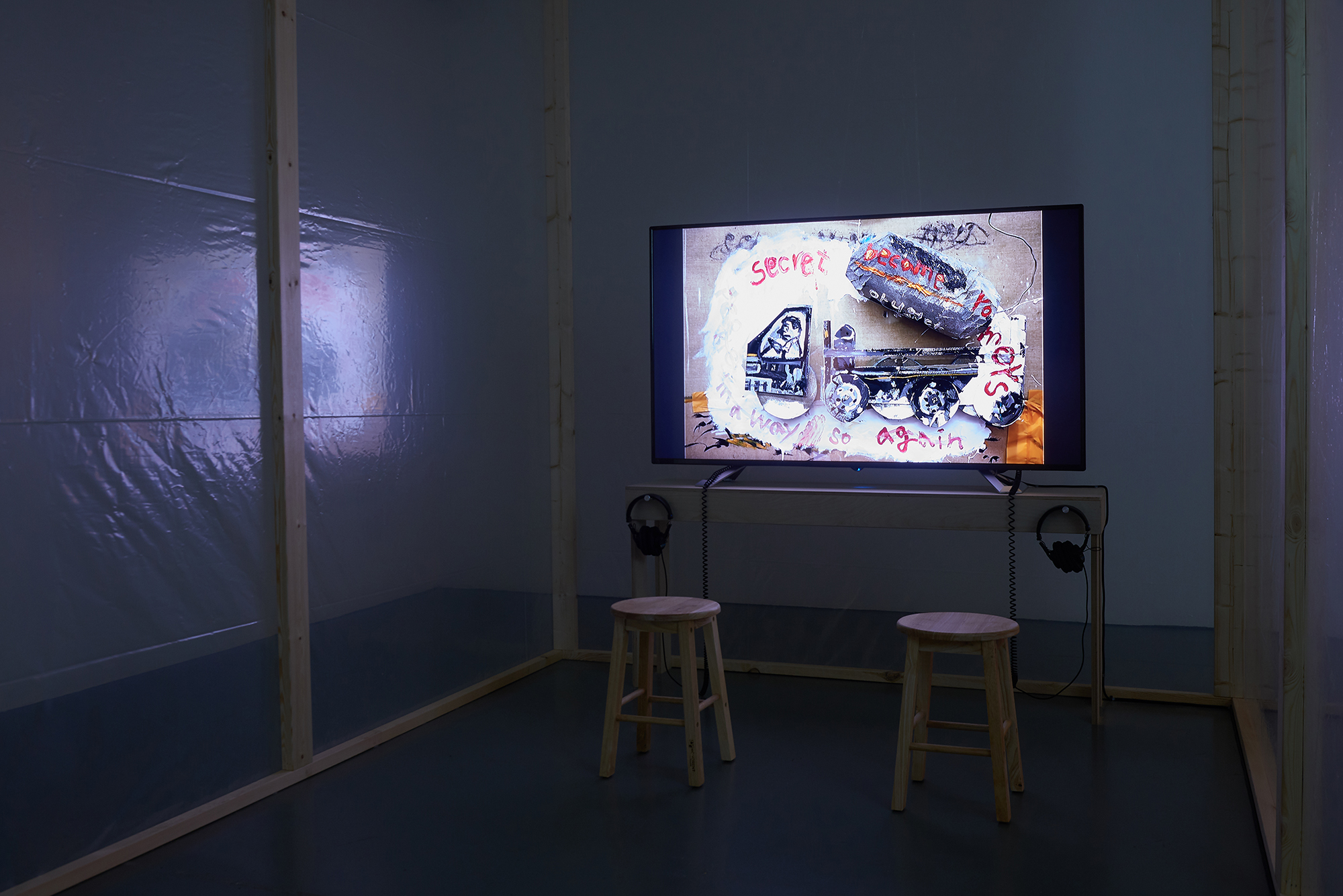 <스튜디오 B 로 가는 길>은 작업실로 가는 길 또는 작업실에서 작가의 마음에 떠오르는 생각들을 이미지와 텍스트가 혼재된 덩어리들로 형상화하여 보여준다. 이상향의 작업실을 찾아가는 과정이자 창작의 과정 중에 겪는 작가의 생각들이 투박하고 정제되지 않은 표현으로 담겨 있다.